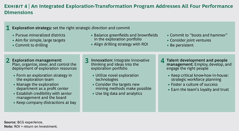 How can companies optimize exploration, address the productivity challenge, and ultimately improve the long-term value of exploration? One powerful way is an integrated approach that addresses the four performance dimensions discussed in this report: exploration strategy, exploration management, innovation, and talent development and people management. (See Exhibit 4.)