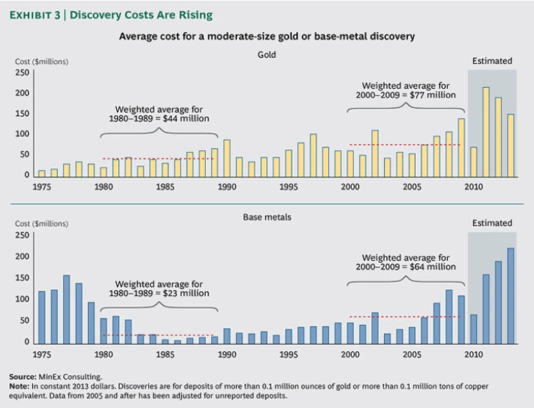 Although more money is being spent, fewer large discoveries are being made today than in the previous quarter century. MinEx calculates that the weighted average cost of base-metal discoveries nearly tripled, from $23 million from 1980 through 1989 to $64 million from 2000 through 2009. (See Exhibit 3.) And since then, exploration performance has continued to deteriorate.