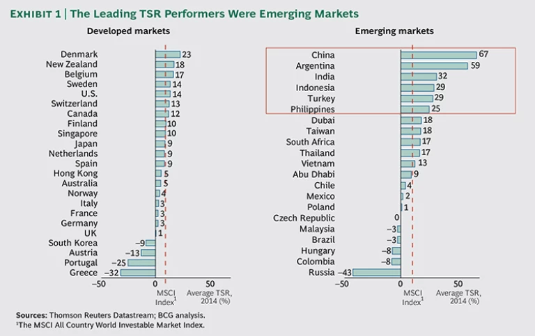 In 2014, emerging markets continued to deliver the highest annual TSR, with China claiming the top spot (67 percent), followed by Argentina (59 percent), India (32 percent), Indonesia and Turkey (29 percent), and the Philippines (25 percent). (See Exhibit 1.) Among the developed economies, the big winners were Denmark (23 percent), New Zealand (18 percent), and Belgium (17 percent).