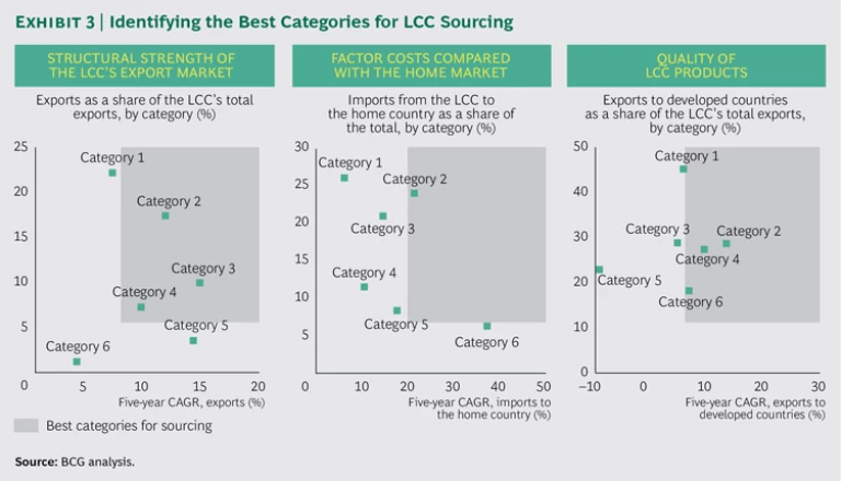 - Categories. A company should not assume that LCC sourcing is more advantageous for all MRO categories. In addition to cost, for each category, the company should consider, for example, the structural strength of the LCC’s export market (as measured by the growth rate of exports), factor costs compared with the home market (as measured by the growth rate of imports from the LCC), and the quality of parts produced in the LCC (as measured by the growth rate of exports to developed countries). (See Exhibit 3.) A company should create a short list of categories for which LCC sourcing is most favorable and then reach out to suppliers in LCCs to explore opportunities.