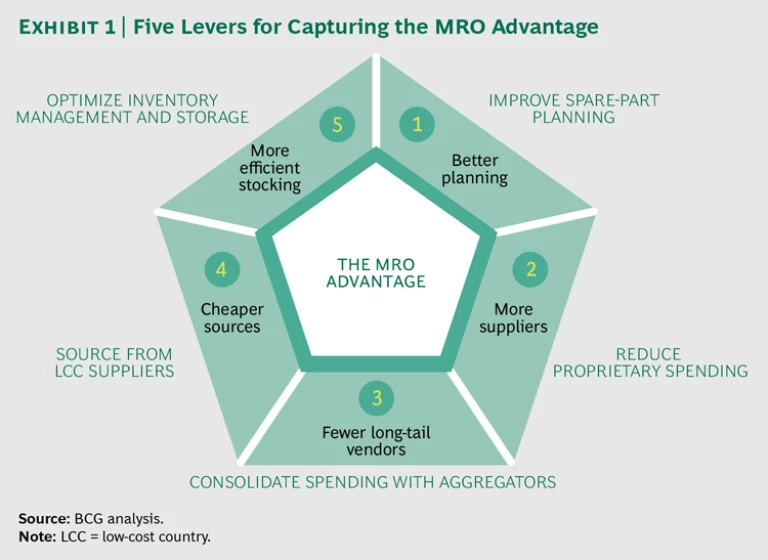 To capture the MRO advantage, manufacturers should apply a comprehensive approach: improve spare-part planning, reduce proprietary spending, consolidate spending with aggregators, source from LCC suppliers, and optimize inventory management and storage. (See Exhibit 1.)