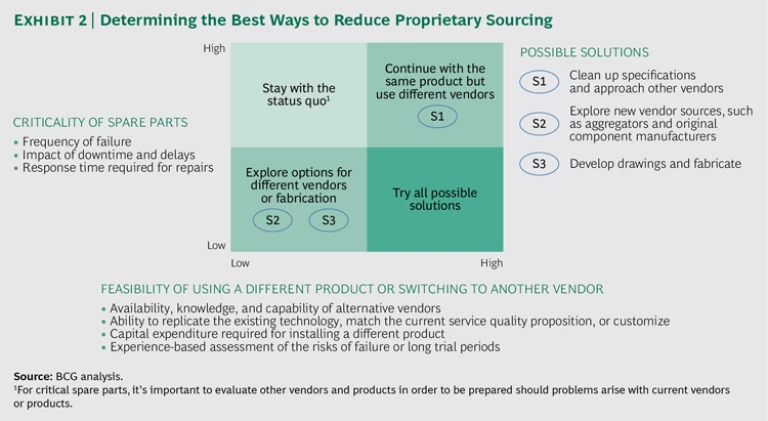 To determine whether a part that the company currently purchases from an OEM or a single-source supplier is a good candidate for an alternative sourcing arrangement, the company should consider the part’s criticality and the feasibility of switching suppliers. (See Exhibit 2.) For parts with high criticality and low feasibility of switching, the company should maintain the proprietary-sourcing arrangement. For all other parts, it should explore alternative-sourcing options.