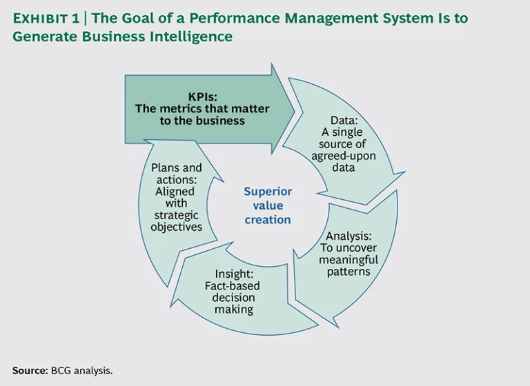 There is a better way. Companies can significantly improve performance management without investing substantial resources in new IT systems. To do so, however, they need to step back and take a more strategic and holistic approach. The senior management team, led by the CFO, needs to start by identifying the metrics that really matter in guiding the business and building an organizational system for translating that data into actionable business insights and more effective decision making. (See Exhibit 1.) Automation and software can be important enablers, but only when their use is informed by this strategic perspective.