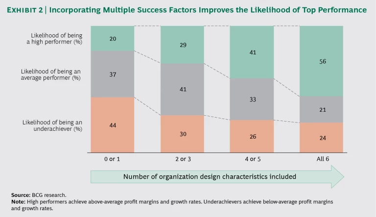 While organization design must be tailored to an individual company’s needs, enterprises that incorporate at least one of the six ingredients described above are likely to see above-average growth and profits. And companies that incorporate all six increase the likelihood of a becoming top performer to more than 50%. (They do this, in part, by reducing the overall complicatedness that can impede financial performance. For more on this topic, see Mastering Complexity Through Simplification: Four Steps to Creating Competitive Advantage, BCG Focus, February 2017.) By contrast, companies that incorporate just one of the six ingredients have only a 20% chance of becoming a top performer—and a 44% chance of underachieving. (See Exhibit 2.)