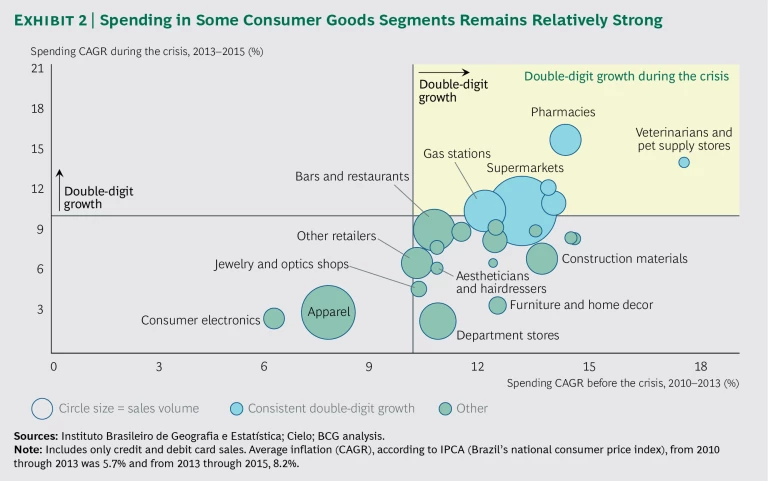 Specifically in consumer goods companies, the double-digit growth rates of the past—once widespread—are now scarce. Yet some segments—including pharmacies, pet supply stores, and gas stations—managed to post strong growth even during the crisis. (See Exhibit 2.) (See Finding Islands of Consumer Spending Opportunity in Brazil’s Crisis, BCG Focus written in collaboration with Cielo, October 2016.)