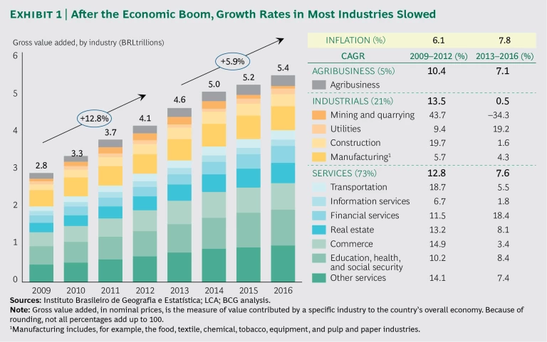 Among the economic sectors, industrial companies were hit hardest by the crisis, growing only 0.5% per year from 2013 through 2016, compared with a 13.5% growth rate from 2009 through 2012. Services and agribusiness were also impacted, but at least their growth rates have stayed close to inflation. (See Exhibit 1.) On the positive side, utilities and financial services grew the most, at 19.2% and 18.4%, respectively.