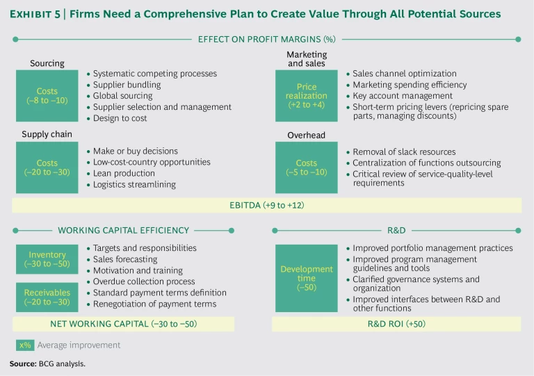 Because Brazil’s economy has slowed, revenue growth has become a less important means of creating value for investors. Instead, firms need to focus on other levers—particularly profit margins—to generate the returns that LPs demand. Specifically, PE firms should develop a full-potential plan for capturing all sources of value creation over the entire lifetime of a deal. Regarding operational improvements, BCG experience shows that this holistic approach may lead to a 9% to 12% increase in EBITDA, a reduction in net operating working capital of 30% to 50%, and improvement of up to 50% in R&D ROI. (See Exhibit 5.)