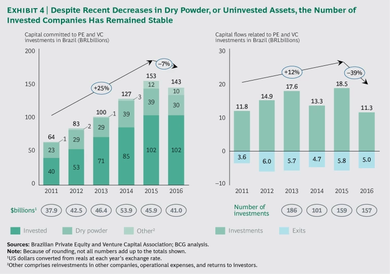 In 2016, after a series of record-breaking years, the assets committed to investments in Brazil decreased by 7%, and the total value of PE and VC investments in the country reverted to 2011 levels. (See Exhibit 4.) Despite those factors, the number of investments remained stable, so the competition for attractive investments should remain just as fierce as in the past several years.