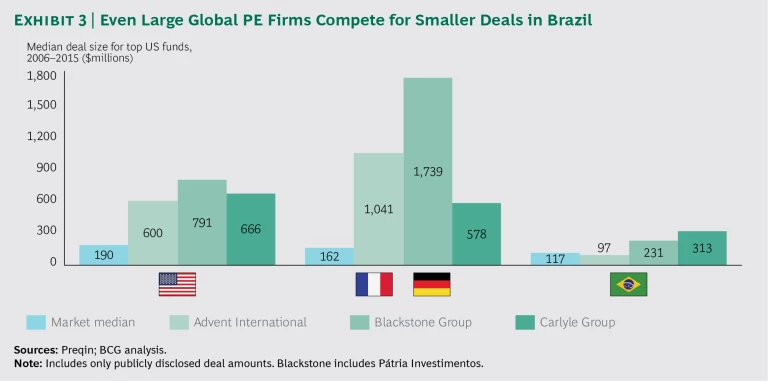 That clustering means that firms must operate on a smaller playing field, increasing the competition for assets. Even such global megafirms as Blackstone Group (represented primarily by its partner in Brazil, Pátria Investimentos), the Carlyle Group, and Advent International, which focus on much larger deals in other markets—such as the US, France, and Germany—compete for smaller deals in Brazil. (See Exhibit 3.)