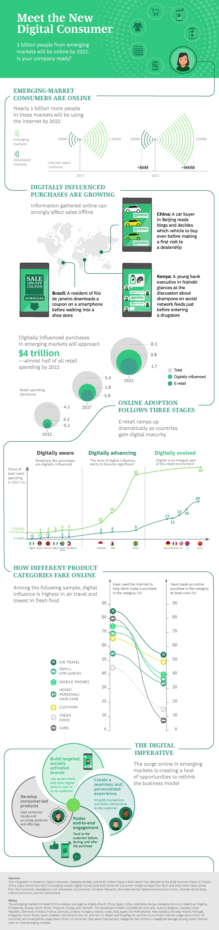This infographic is based on Digital Consumers, Emerging Markets, and the $4 Trillion Future, a BCG report that debuted at the 2018 Summer Davos in Tianjin, China. Data comes from BCG’s Emerging Market Digital Survey 2018 and Center for Consumer Insight surveys from 2017 and 2018. Other data comes from the Economist Intelligence Unit, eMarketer, Euromonitor, Forrester Research, the International Telecommunications Union, Internet World Stats, Oxford Economics, and the World Bank.