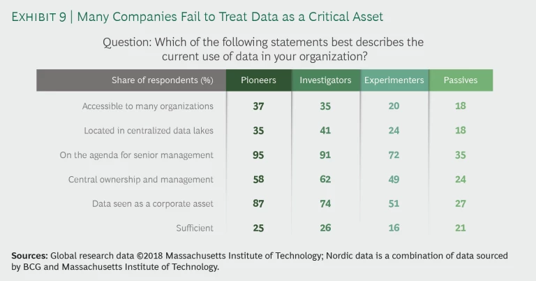 Although data is a topic for senior management, and pioneers and investigators rank it high in importance (95% and 91%, respectively) and understand the significance of treating data as a corporate asset (87% and 74%, respectively), these companies have yet to fully harness the power of their data. Only slightly more than half of all pioneers, investigators, and experimenters reported central ownership and management—a key success factor for launching AI at scale—as a top pick. Without central ownership and management, companies would find it difficult to implement any data and AI strategy—even as a top agenda topic and viewed as a corporate asset. For the most part, data is located in silos rather than in a centralized data lake, creating inefficiencies for AI use cases in processing data ingest and egress. (See Exhibit 9.)