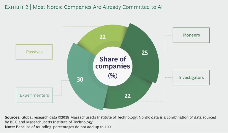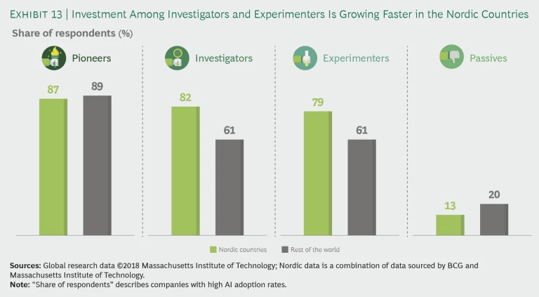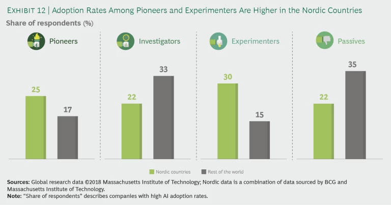 Nordic companies have a higher AI adoption rate than their global peers. Compared with the rest of the world, they have more pioneers and experimenters and fewer passives. (See Exhibit 12.)