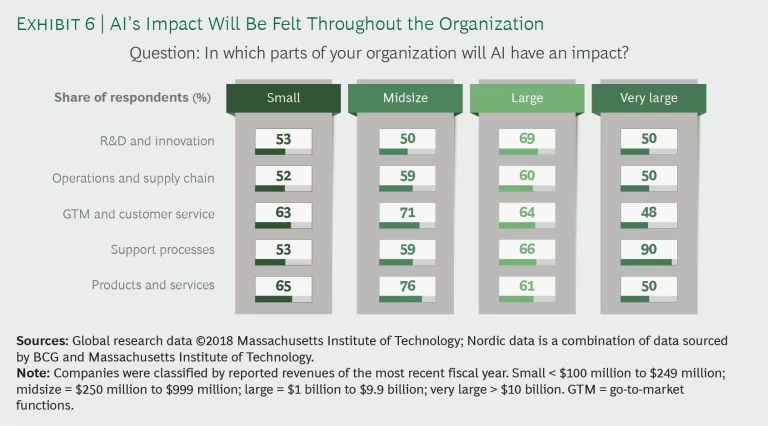 As they gain increasingly specific understanding of the effects of AI on functional parts of their business, small and midsize enterprises expect significant changes in go-to-market functions, customer service, and products and services. Large enterprises expect noteworthy changes in R&D and innovation and support processes, while very large enterprises expect that the changes will be in support processes. Although go-to-market functions, customer service, and products and services may offer opportunities for reducing costs, many of the AI use cases today indicate that pricing and marketing offer clear revenue-increasing opportunities. More of the cost reduction opportunities come from implementing AI in support processes—the functional area in which very large enterprises expect a significant impact. (See Exhibit 6.)