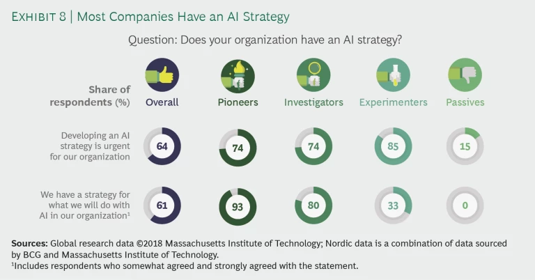 In addition to having high expectations and increasing their investments, approximately 77% of pioneers, investigators, and experimenters recognize the urgency for charting an AI strategy. Of the group that recognizes the urgency, 93% of pioneers and 80% of investigators responded that they have an AI strategy. Experimenters are straggling far behind with 33% reporting that they have a strategy. This is surprising, given that 85% of experimenters reported that they recognized the urgency for developing one. (See Exhibit 8.)