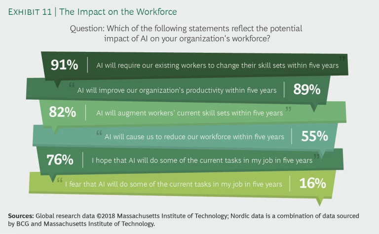 Among the respondents, 89% said that AI will improve the organization’s productivity. Only 55% said that productivity will come about in tandem with a reduction of the workforce within five years. Rather, 91% expect AI will require existing workers to acquire new skill sets within the five-year period, and 82% believe that the change will be an augmentation of existing skill sets. One implicit understanding is that many companies recognize that AI talent will be scarce in the years to come, so there will be a need to develop capabilities internally. Companies can retrain the existing workforce with the skills required, and they need to learn how to make the best use of AI within employees’ roles. This implicit understanding coincides with a general enthusiasm for AI: 76% of respondents said that they hope that AI will take on some of their current tasks, while 16% reported that they fear that AI will take on some of their current tasks within the next five years.