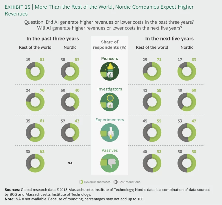 In surprising contrast to Nordic companies, more global peers across maturity clusters reported believing that AI will reduce costs, rather than drive revenues, compared with the past three years. This trend is the inverse of the opinion in Nordic companies, most of which reported that they expect revenue increases rather than cost reductions. (See Exhibit 15.)