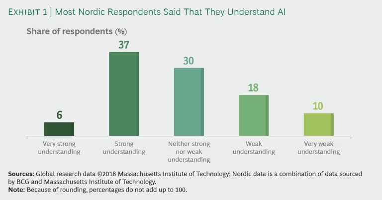 Currently in the discovery phase, Nordic companies are actively engaged in understanding and implementing AI. The Nordics have a rich history of innovation—from the era when magnetic compasses, long boats with keels, and tents gave Vikings the competitive edge to today, when Denmark, Sweden, and Finland all rank in the top 10, and Norway and Iceland (not included in this study) are in the top 25 of the 2018 Global Innovation Index. So it comes as no surprise that only 28% of Nordic companies reported having a weak or very weak understanding of AI. (See Exhibit 1.) Nordic companies operate in a business environment that has ample support for digital initiatives from respective government institutions, a large number of residents who are connected to broadband internet and are active in the digital land-scape, and high-quality academic institutions that generate a relevant and capable talent pool. The R&D ethos is strong in the Nordics: all Nordic countries were in the upper percentiles of developed nations for the number of professionals per million of the population engaged in R&D.