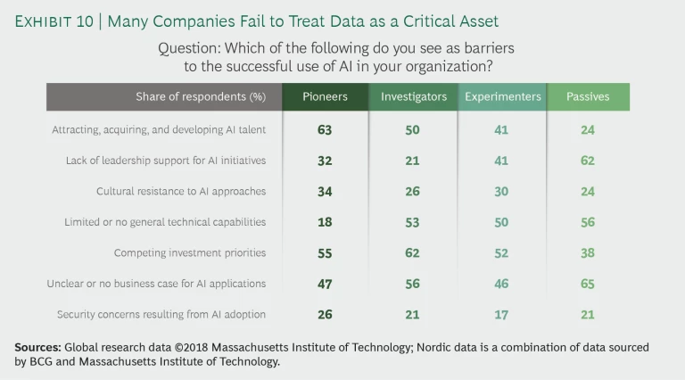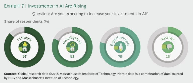 Of all the responding companies, 67% reported that they had increased their investment: specifically 87% of pioneers, 82% of investigators, 79% of experimenters, and 13% of passives. (See Exhibit 7.) Investments in AI include sourcing and hiring AI talent, acquiring and developing AI technology, acquiring and man- aging the data required, as well as implementing the new processes for training AI algorithms. The fact that such large proportions of pioneers, investigators, and experimenters are financially committed to AI supports Nordic companies’ claims that they have high expectations for business value from AI within the next five years.