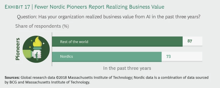 This is interesting in light of the fact that the Nordic companies surveyed comprised a larger proportion of pioneers than the rest of the world. A possible explanation for global pioneers’ more mature business sense may be seen in the high percentage—87%—of them reporting that they’d realized business value from AI in the past three years compared with 73% of Nordic pioneers. (See Exhibit 17.) The learning and experience that global pioneers had acquired over the past three years may have provided them with valuable insight into developing more coherent business cases for AI applications.