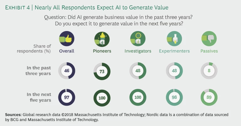 In addition to the heightened anticipation that AI will affect business models, almost 100% of pioneers, investigators, and experimenters predicted that the implementation of AI will generate business value within the next five years. And 89% of passives expect to see positive effects in the near future even though they trail behind peers in AI adoption. (See Exhibit 4.)