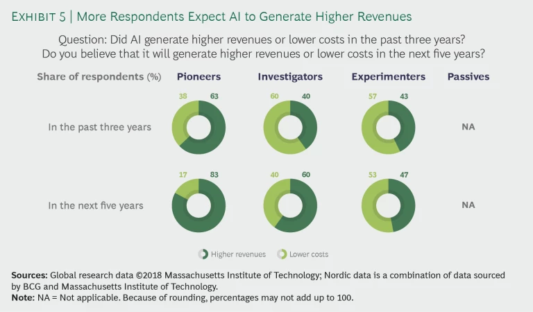Digging deeper, we found that many companies are starting to expect the value from revenue increases rather than cost reductions. While 63% of pioneers reported generating incremental revenues from the implementation of AI in the past three years, a whopping 83% are now focusing on leveraging AI to increase revenues rather than reduce costs in the next five years. It’s worth noting that investigators have flip-flopped their opinions. A majority had believed that AI would reduce costs in the past three years, and now a majority expect AI will increase revenues over the next five years. Experimenters lag: the number of those who expect higher revenues rather than cost reductions increased by only 4 percentage points. Combining the top three clusters, 30% more companies have shifted their thinking toward counting on increased revenues. (See Exhibit 5.)