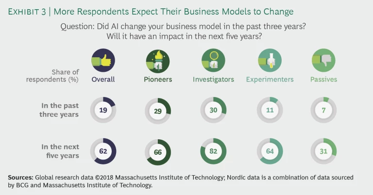 Of the responding Nordic companies, 62% reported that they expect that AI will bring about a shift in their business model within the next five years—significantly more than the 19% that reported that AI had changed their business model in the past three years. Investigators and experimenters reported the biggest changes in opinion: roughly 53 percentage point differences. (See Exhibit 3.)