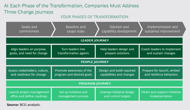 What’s more, the actions that need to be taken—and the readiness of the leaders, employees, and programs—will vary widely depending on where a company is in its transformation journey. During the goals and commitment phase, for example, companies may be focused on establishing a core leadership team aligned around the vision; but during implementation, frontline leaders must be fully capable of driving change.