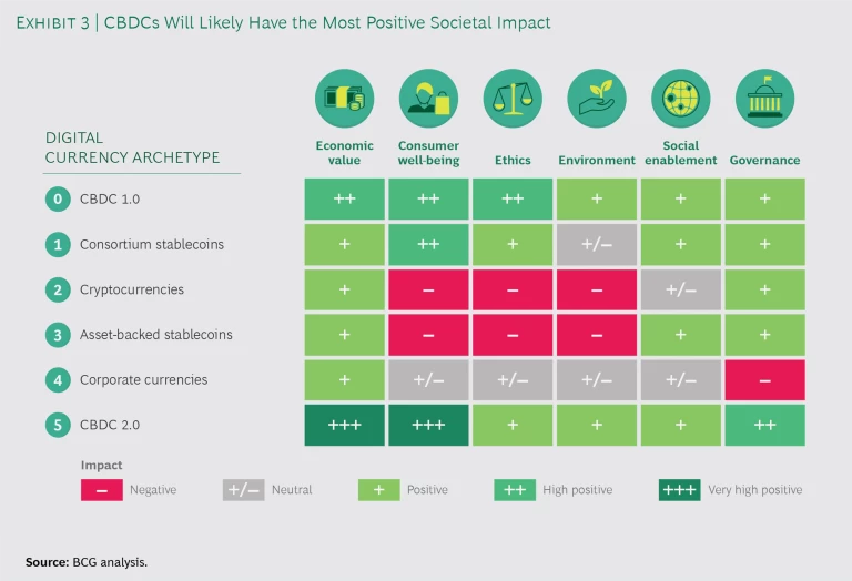 How a currency is designed can also have societal impacts, which can influence a currency’s longer-term competitiveness and value. As International Monetary Fund analysts Tobias Adrian and Tommaso Mancini-Griffoli noted in a September 2019 post to IMFBlog, “Payments are more than the mere act of transferring money. They are a fundamentally social experience linking people.” BCG’s total societal impact analysis finds that economic, consumer, ethical, environmental, social enablement, and governance factors can impact a currency’s risk and return. For example, CBDCs and consortium stablecoins are likely to open up more sources of value and generate the most positive societal impact, while the more anonymous or closed nature of cryptocurrencies and asset-backed stablecoins raises ethical concerns that can constrict value. (See Exhibit 3.)
