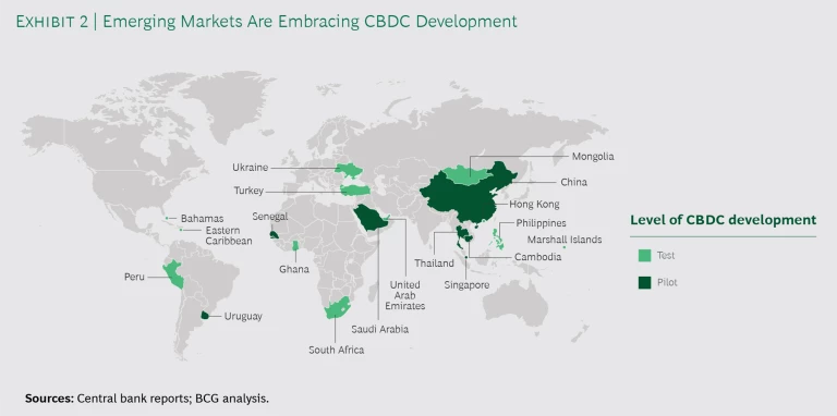 Banks and other financial institutions have been drawn to the efficiency of digital cash because physical tender is expensive to move, store, and dispense. Businesses and governments are also excited about the potential for digital currencies to increase economic inclusion and reduce financial crimes. The World Bank estimated in 2018 that 1.7 billion adults remained unbanked, an issue exacerbated by the limited reach of physical banking infrastructure around the world. Digital ledger technologies could help bring people into the financial system. Although regulatory standards would need to be updated to include this capability, blockchain could allow client onboarding and know-your-customer documentation to be completed on a peer-to-peer basis, without need of a formal banking arrangement. Countries could use digital currencies based on distributed ledger technologies to improve tax collection and traceability. These are among the reasons why emerging markets countries have been some of the most active proponents of central bank digital currencies (CBDCs). (See Exhibit 2.)