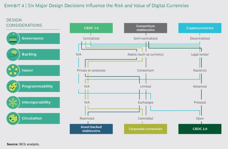 - Create a digital and regulatory sandbox to experiment with promising use cases. Based on their strategic analyses, leaders should identify two or three high-potential initiatives and begin small-scale pilots, such as developing an asset-backed stablecoin or collaborating on a CBDC. Understanding the design choices that go into creating a digital currency, such as governance, programmability, and the type of backing, can help leaders determine which archetypes are most suitable for their needs and which to avoid. Most of these design choices operate on a spectrum, from centralized to decentralized in the case of governance, for example, and from restricted to open in the case of circulation. How currency models mix and match these characteristics can influence their use and value. (See Exhibit 4.) Creating an experimental sandbox, where teams can explore new technologies, digital competencies, and ways of working can reduce error and waste in the long run and help organizations scale proven initiatives faster.