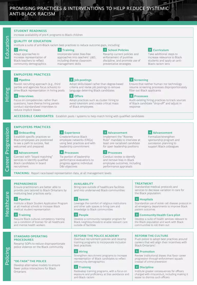 There is no single solution that can undo hundreds of years of racism, and solutions will need to come from a wide range of places, organizations and individuals. As part of this work, we scanned and compiled examples of promising practices that could make up the quilt of solutions required to start to change the experience of Black individuals in Canada.