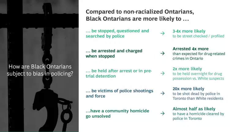 This reality of police bias takes its toll – among Black Ontarians subject to bias-driven street checks, three quarters reported a decreased sense of belonging in society, and 60% reported negative mental health effects.