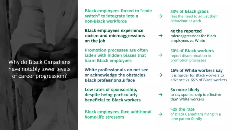When Black people do succeed in finding a job, systemic racism in the workplace can result in hitting up against a glass ceiling. In addition to facing microaggressions and having to “code switch” (defined as a person changing the way they express themselves when they are around non-racialized people in the workplace), Black employees have low rates of sponsorship and find hidden biases in promotion processes. This is reflected in the data that shows Black leaders hold less than 1% of executive roles and board seats at major Canadian companies.
