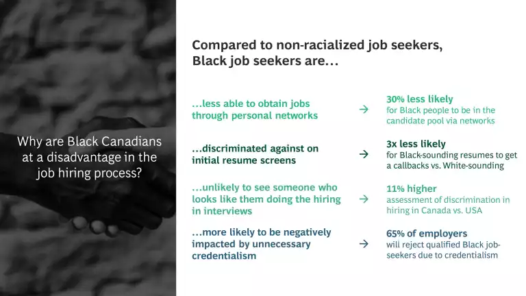 What drives these higher unemployment figures? Black people in Canada face many systemic challenges and barriers in the hiring process. Even when experience is comparable to that of non-Black candidates, systemic biases make it more difficult for Black candidates to land positions for which they are qualified.