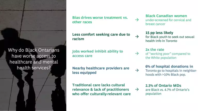 Health and Community Services. A lack of access to health care in Black communities leads to worse physical and mental health outcomes for Black people in Canada compared to other groups.
