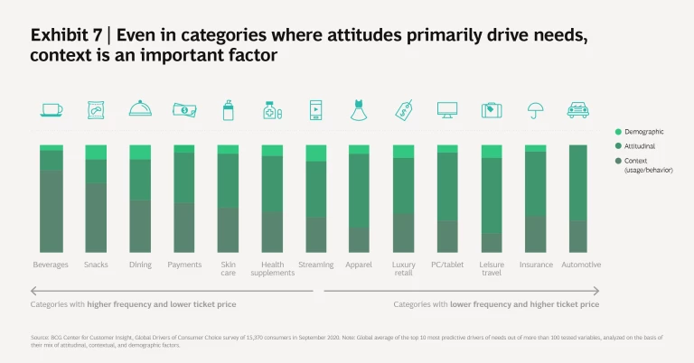 Context also plays an important role in categories that businesses have traditionally regarded as being highly associated with the consumer’s personality, such as automobiles. Our research found that attitudes such as the belief that the car “represents who one is” are important. But the two leading considerations that defined needs in consumers’ most recent purchase were contextual: whether they were buying their first vehicle and what specific use cases they had in mind for the car, such as whether it would be driven on highways or off road. In the case of health supplements, the location where the buyer planned to consume the product took precedence over such factors as attitude toward health and whether the consumer typically preferred natural products.