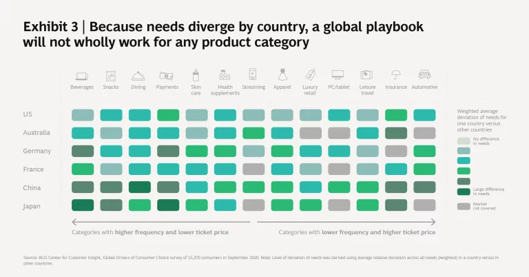Just as consumers’ attitudes differ around the world, so do their needs. This holds true not just for products commonly tailored to local tastes—such as beverages, snacks, and dining—but also for needs in the automotive, insurance, PC and tablet, and even payments categories, in which companies invest relatively little time localizing their offerings. (See Exhibit 3.) In only a few categories—such as leisure travel, luxury retail, and content streaming—did needs remain relatively similar across the globe. Supply could be the reason: Netflix, Amazon, and other streaming players offer very similar content around the world, usually with local translation or subtitles. In the case of luxury products, similarities in global needs may reflect demand for the signature nationalities of the products and brands purchased, as opposed to local customization. But even in such categories, which are exceptions, consumers in China and Japan expressed some distinct local needs.