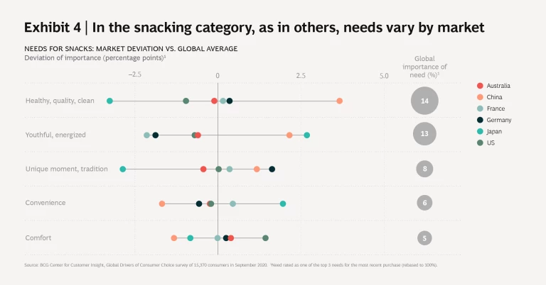We can understand this dynamic better by diving a bit deeper into one category: snacks. Chinese consumers cite a much higher need for health and quality when purchasing a snack than do their counterparts in the other markets we studied. Japanese consumers, for instance, attached a higher importance to “convenience” when snacking. Clearly, companies should not take localization lightly in the snacking category. (See Exhibit 4.)