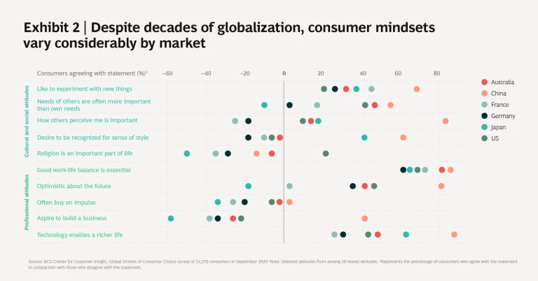 Our analysis of survey results from more than 15,000 consumers, taking hundreds of variables into account, yielded a number of insights that run counter to conventional wisdom. Despite decades of globalization, for example, we found that consumer mindsets still vary significantly in different parts of the world, including in markets that are generally regarded as similar. In fact, even though many marketers see millennials and Gen Z as important global segments, attitudinal differences from one market to another are just as pronounced among members of these younger generations as among their elders.