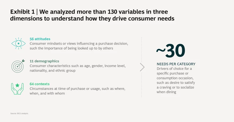 BCG’s CCI has long been intensively studying consumer behavior and purchasing decisions in specific markets and used the firm’s Demand Centric Growth methodology to understand key drivers of choice. What we haven’t previously attempted is to analyze how the balance of three crucial dimensions—consumer demographics, attitudes, and context—applies across goods and service categories and across countries to influence consumer needs and, therefore, choice. (See Exhibit 1.)