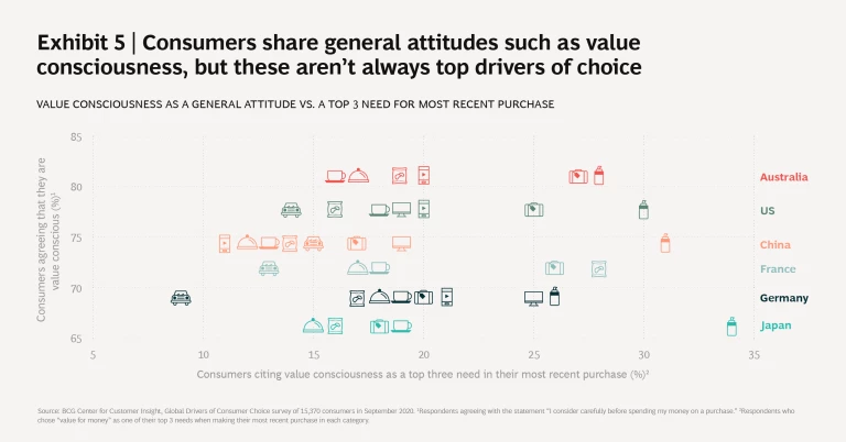 Except in a few cases, however, our research found little correlation between value consciousness as a general mindset and the role that value played in actual purchasing decisions. While consumers in each of the six countries agreed that value consciousness is an important consideration—ranging from 67% in Japan to 81% of Australia—a much smaller minority cited value as one of the three leading needs in their most recent dining, snacking, beverage, auto, PC, or video streaming purchase. For instance, although nearly 70% of German consumers said they considered themselves to be value conscious, less than 9% of them viewed value as being a top-three need in their latest automotive purchase, and only 25% considered it a top-three factor in their most recent PC or tablet purchase. (See Exhibit 5.)