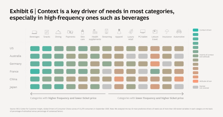 In the fall of 2020, we launched a major study that will eventually cover 18 of the world’s most important markets. The first phase of this research focused on Australia, China, France, Germany, Japan, and the United States. In each market, we interviewed a representative group of consumers of various ages and income levels, asking them to identify their level of agreement with 56 attitudinal statements. We then asked them which key needs influenced their most recent purchase or consumption decision, as well as the context at the time of their most recent purchase or usage occasion, in 13 categories: beverages, snacks, dining, payments, skin care, health supplements, streaming, apparel, luxury retail, PCs/tablets, leisure travel, insurance, and automotive.