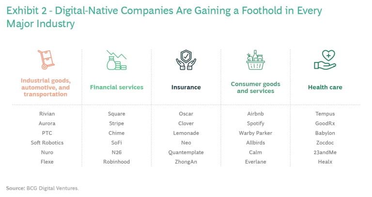 The most recent wave of digital attackers is pushing past the traditional high-tech industries, demonstrating the power of the innovation flywheel in new sectors and new contexts. (See Exhibit 2.)