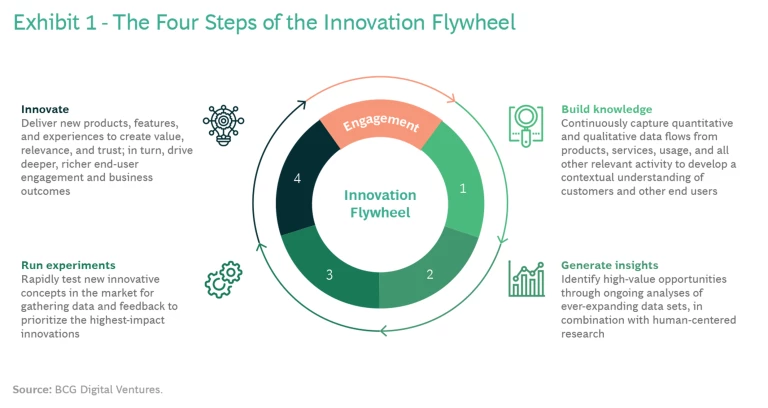 These digital-native attackers give some idea of what the innovation flywheel looks like at scale: ever-expanding customer engagement generating massive amounts of data and insights.