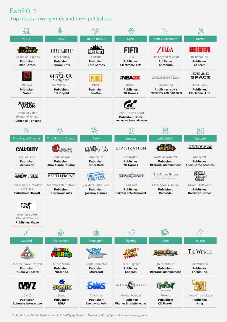 Games and the publishers behind them compete across a landscape of different genres (Exhibit 1) and platforms (mobile, PC, and console – discussed in next section). Even within a specific genre, the differences between titles is stark. From graphics and game mechanics, to the overall theme and subject matter, consumers have an immense selection to choose from. Some genres are sub-genres of others (e.g., Multiplayer Online Battle Arena, or MOBAs, came from Strategy games) and some titles are hybrids of genres (e.g., GTA is an action/adventure sandbox with some role-playing game elements). While no standard classification exists, the industry does a good job of self-managing the categorization of genres.