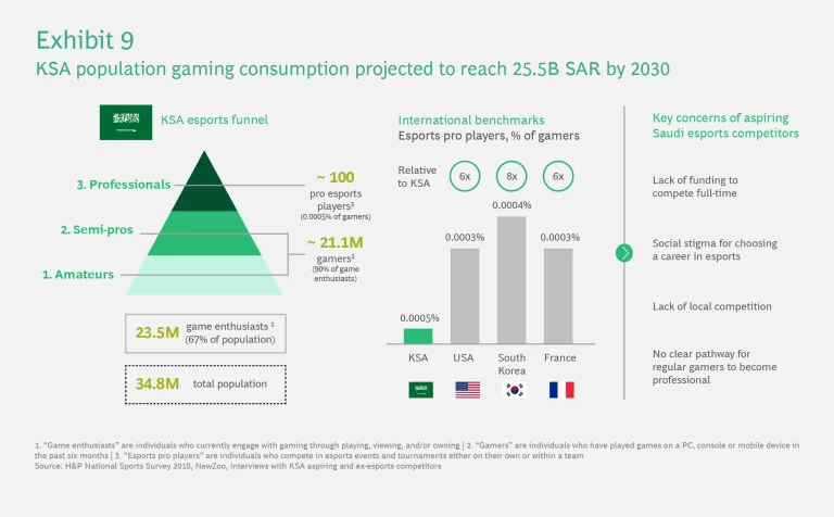 Despite this progress, however, talent attraction – especially to the esports sector – faces several structural and societal barriers. Saudi Arabia has approximately 100 pro esports players – representing 0.0005% of regular gamers. In contrast, USA and France have 6x the proportion of pros vs. gamers, and South Korea 8x. Aspiring Saudi competitors note a lack of funding to compete full-time, scarcity of local competition, no clear pathway for gamers to become professional, and social stigma associated with choosing a career in esports