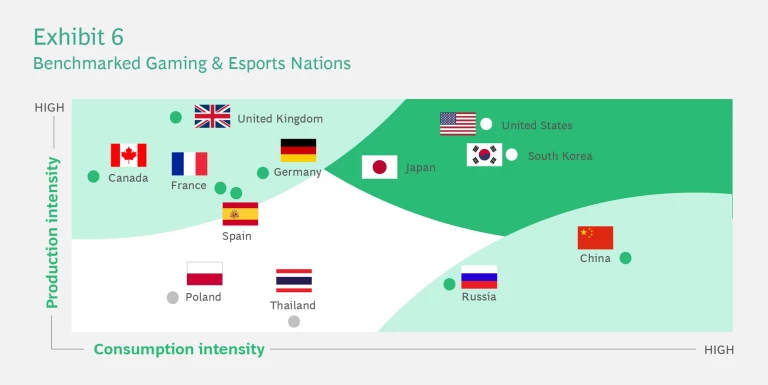 BCG benchmarked leading gaming nations based on the intensity of their Gaming & esports consumption and production to identify best practices globally (Exhibit 6). Consumption intensity was measured by the total market size, consumer engagement (casual and competitive players), and amount of adjacent gaming content consumed (e.g., streamed video content). Production intensity was measured by the total Gaming & esports revenues, number of entities engaged in Gaming & esports activities, and maturity of enabling infrastructure (including education, funding, etc.). Nations were then grouped into three archetypes: (1) Producers: countries that produce more Gaming & esports content than consume; (2) Consumers: countries that consume more Gaming & esports content than they produce, and (3) Leaders: countries that lead globally in Gaming & esports content production and consumption. Below we share key lessons learned and examine selected countries in more depth.