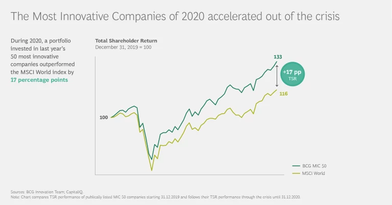 Superior readiness drives value creation—and resilience. Consider BCG’s annual roster of the world’s 50 most innovative companies. The 50 most innovative companies of 2007, just prior to the Great Financial Crisis, delivered total shareholder returns between 2007 and 2012 that were 4 percentage points higher per year than the market.
