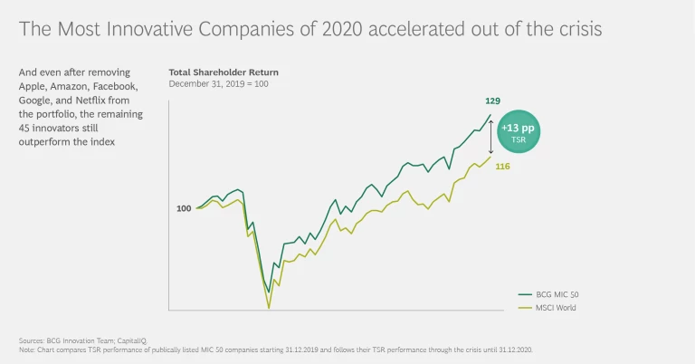 And the story during COVID-19 is similar. Our pre-pandemic 50 most innovative companies of 2020 have outperformed the index by a staggering 17 percentage points in the past year—and even if you remove high-flying tech giants (Apple, Google, Amazon, Facebook, and Netflix), top innovators’ outperformance is still 13 percentage points.