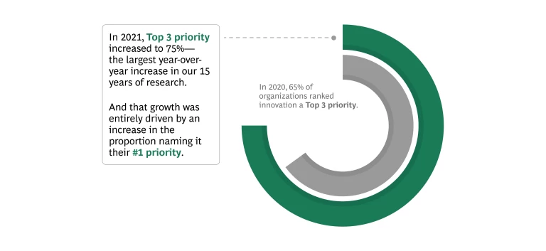 Let’s start with the good news. The number of companies reporting that innovation is among their organizations’ top three priorities is up 10 percentage points in 2021 to 75%—the largest year-over-year increase in the 15 global innovation surveys BCG has conducted since 2005.